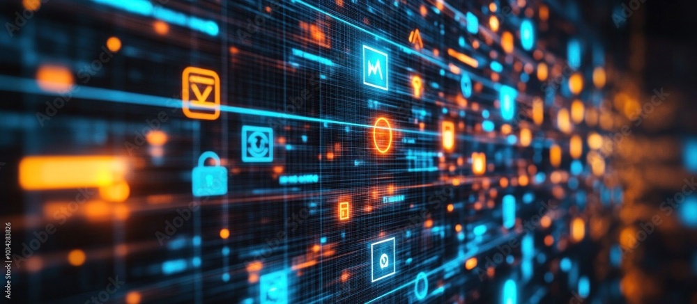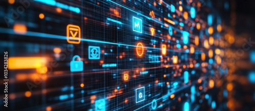 The watermark will not be included on Sticker.: Abstract digital background with glowing lines and icons -