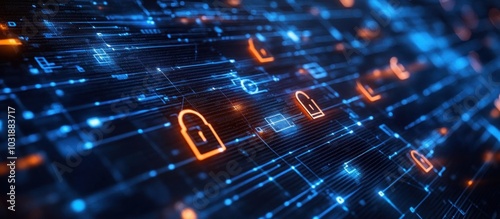 The watermark will not be included on Sticker.: Abstract digital background with glowing padlock icons on a circuit board -