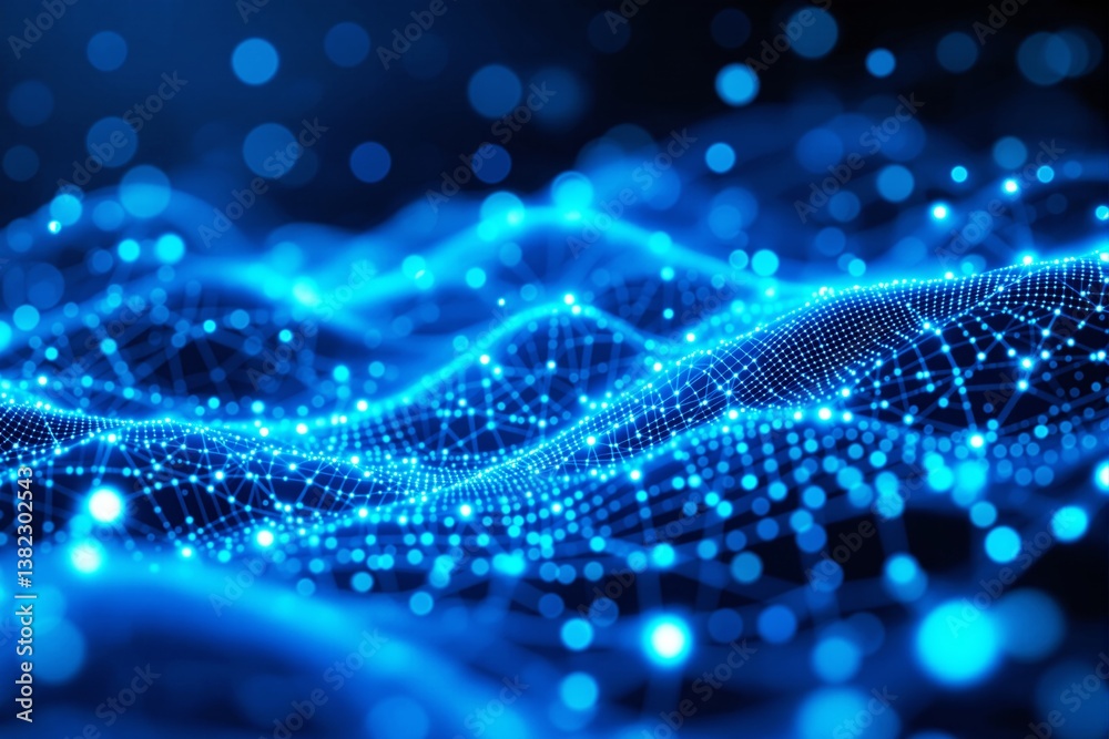 The watermark will not be included on Sticker.: Abstract digital blue wave with glowing dots and lines on dark background -