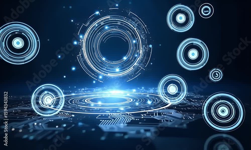 Sticker : Abstract futuristic blue background with glowing digital technology and circuit board elements in th