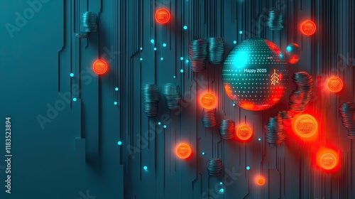 The watermark will not be included on Sticker.: Abstract futuristic technology background with glowing spheres and circuit lines
