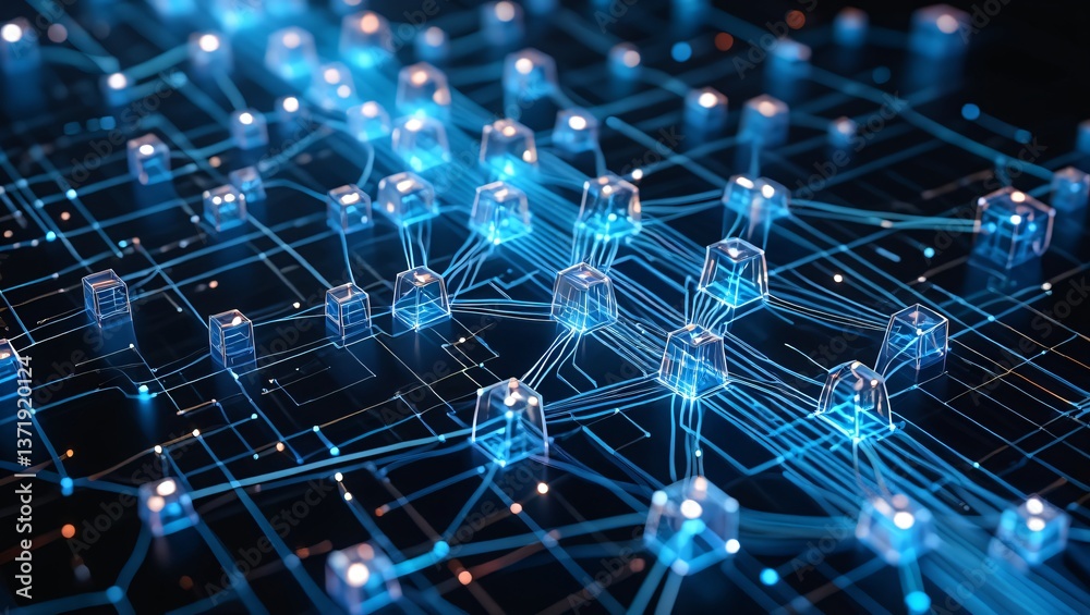 Abstract network data flow illuminated cubes connected by glowing lines digital technology conceptSticker
