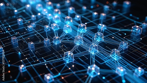 The watermark will not be included on Sticker.: Abstract network data flow illuminated cubes connected by glowing lines digital technology concept