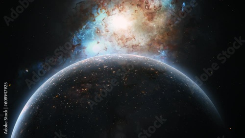 Abstract outer space view unidentified alien planet with double quasar in distant universe backgrounSticker