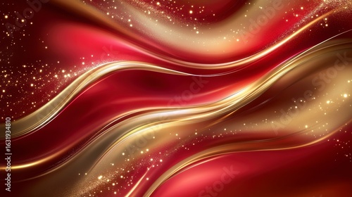 Sticker : Abstract red and gold swirling waves with sparkling particles -