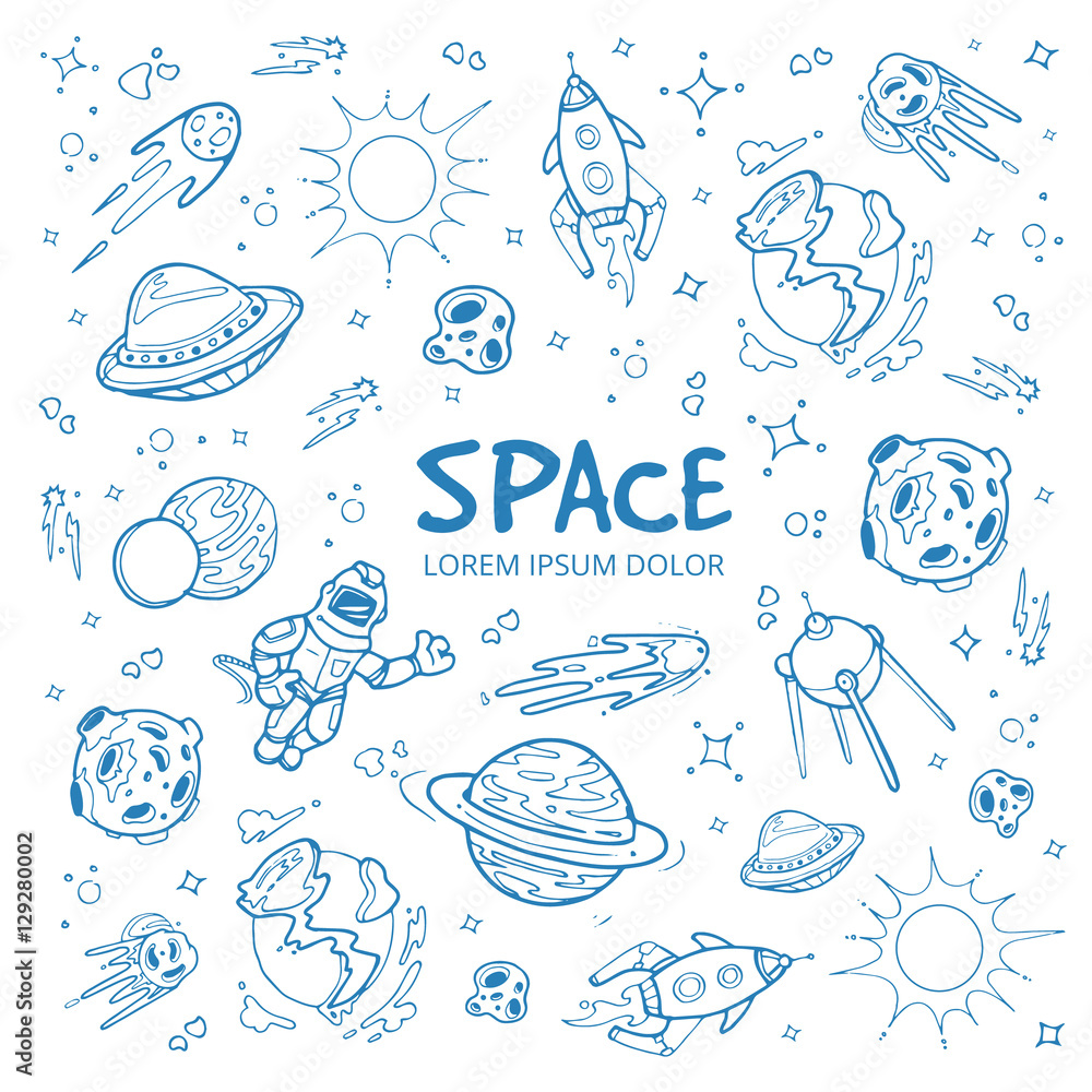 Sticker : Abstract space background with planets, stars, spaceships and universe objects - hand drawn doodles v