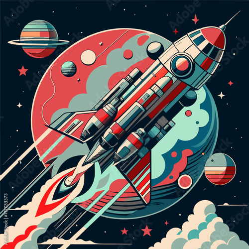 The watermark will not be included on Sticker.: Abstract space drawing with a rocket flying past the planets - eps file -