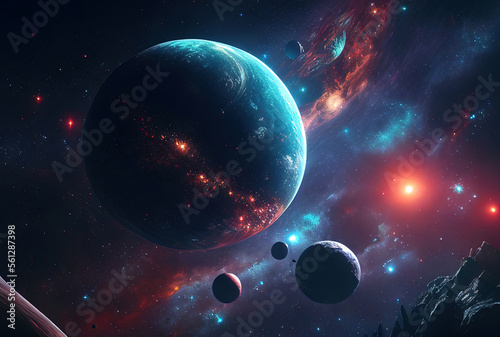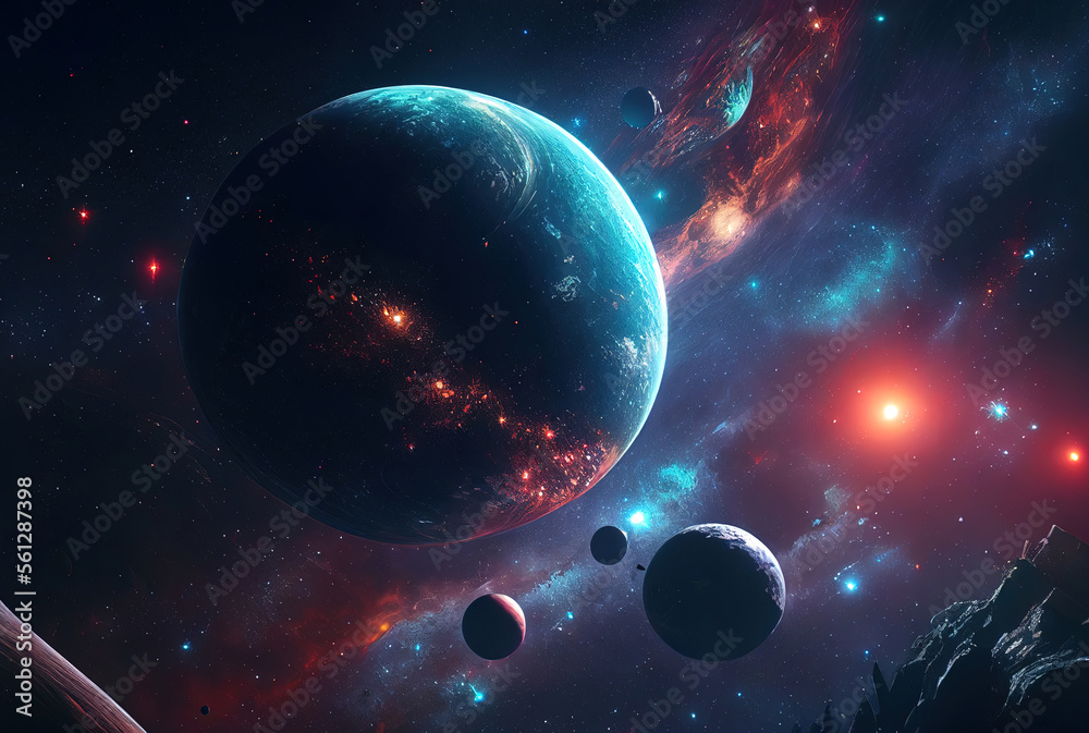 The watermark will not be included on Sticker.: Abstract space landscape with planets and flashes of stars and comets in blue and red colors