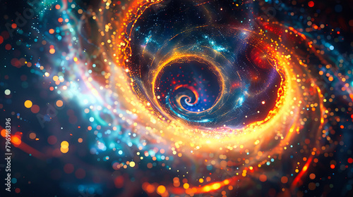 The watermark will not be included on Sticker.: Abstract swirl of glowing neon light particles on a dark background