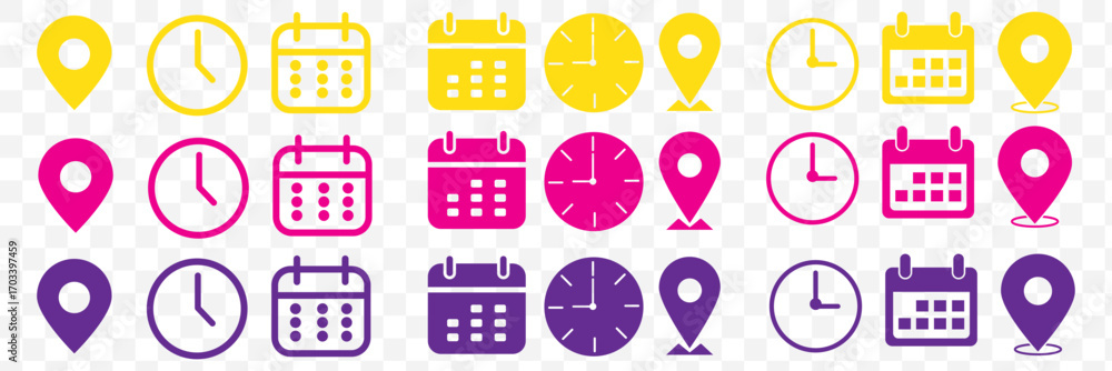 Sticker address time date icons set. address location icon. clock icon. calendar icon. time, date and addres - Stickers Sticker address time date icons set. address location icon. clock icon. calendar icon. time, date and addres - Stickers