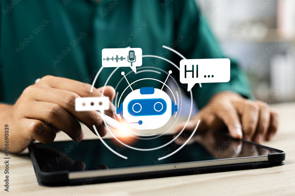 The watermark will not be included on Sticker.: Ai artificial intelligence,digital chatbot, man chatting with digital assistant chatbot on tablet on