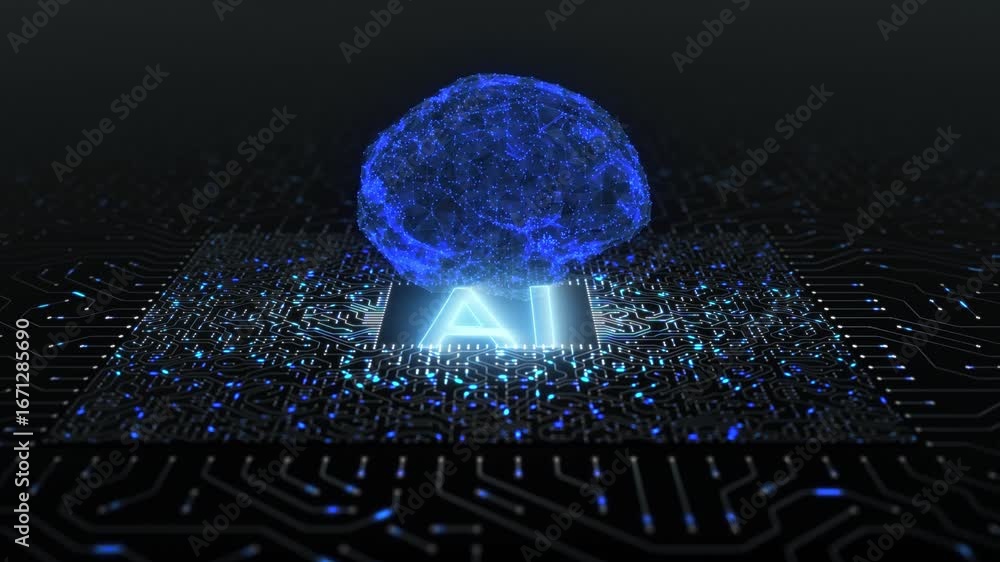 Sticker : Ai artificial intelligence caption and digital brain spins over futuristic motherboard circuits -
