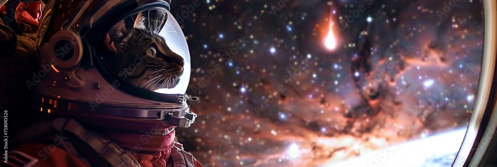 An astronaut cat observing a solar flare from the safety of a spacecraft window with the vastness ofSticker