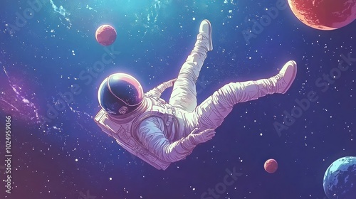 An astronaut floats in space surrounded by colorful planets and cosmic elements - Sticker