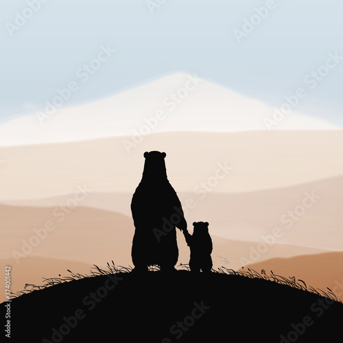 Sticker animal family silhouette. mom bear and baby in misty autumn mountains