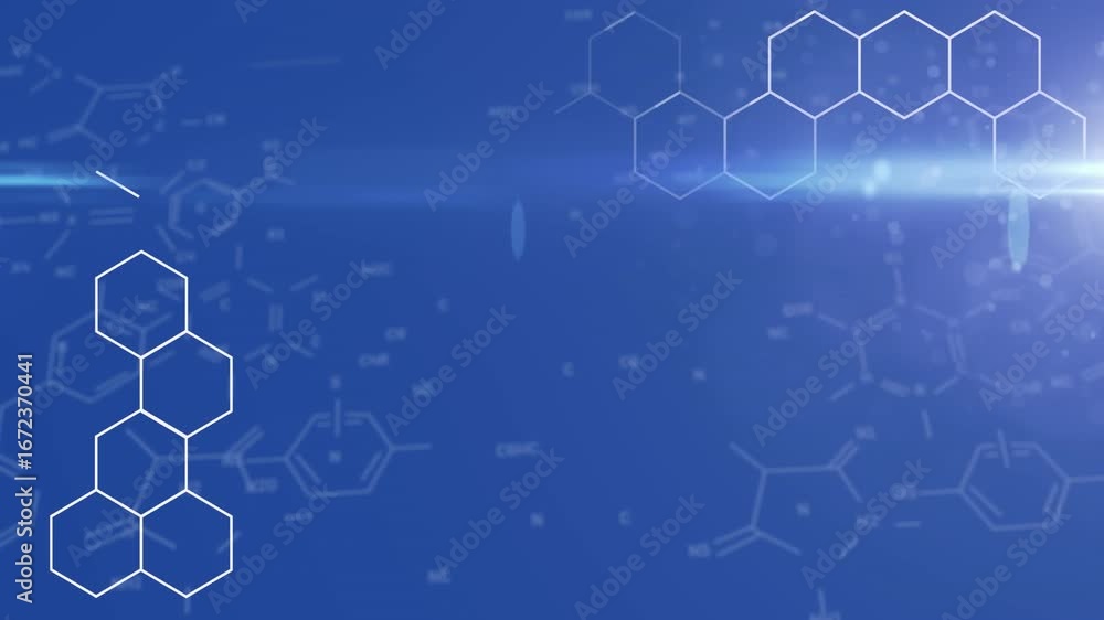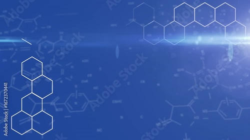The watermark will not be included on Sticker.: Animation of light spot over chemical structures and hexagonal shapes against blue background