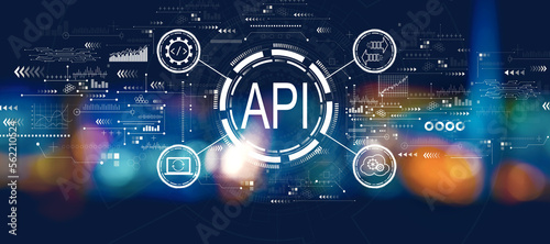 The watermark will not be included on Sticker.: Api - application programming interface concept with blurred city at night