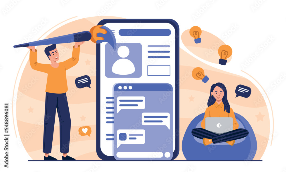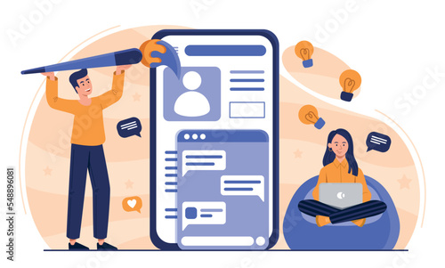 Sticker app interface improvement. man and woman develop ui and ux design for programs and website. freelanc