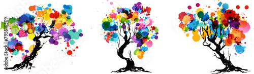 The watermark will not be included on Sticker.: Artistic trees with rainbow paint splashes leaves - hand drawn isolated design elements with ink text