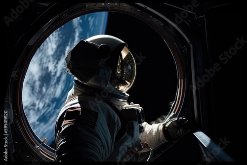 Astronaut, surrounded by the vastness of space, looking through the window of spaceship, created witSticker