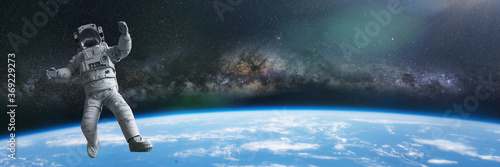 Sticker : Astronaut during a spacewalk in orbit of planet earth, background banner with empty space