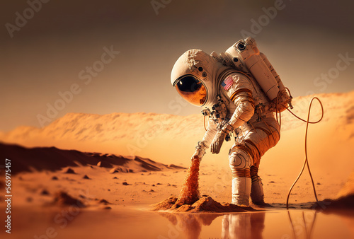 The watermark will not be included on Sticker.: Astronaut filtering water on alien planet - generative ai