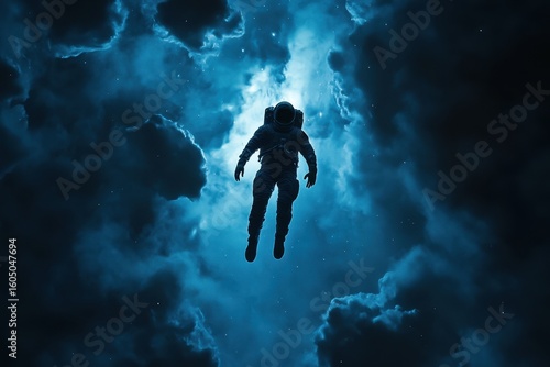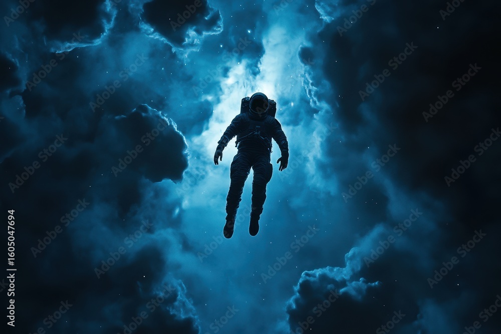 The watermark will not be included on Sticker.: Astronaut floats through clouds in the vastness of space during a serene moment of exploration, sing