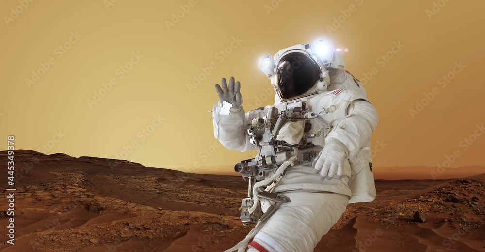 The watermark will not be included on Sticker.: Astronaut in a space suit and a helmet with light stands on the red planet mars greets and waves his