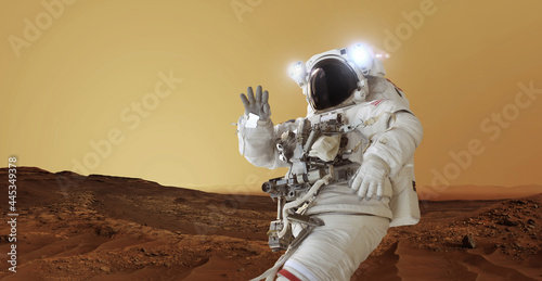 Sticker : Astronaut in a space suit and a helmet with light stands on the red planet mars greets and waves his