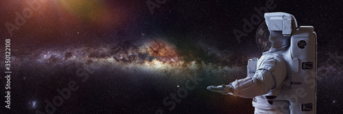 The watermark will not be included on Sticker.: Astronaut presenting an empty space in front of the milky way galaxy