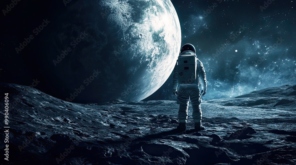 The watermark will not be included on Sticker.: Astronaut standing on a lunar surface with a large planet in the background -