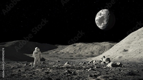The watermark will not be included on Sticker.: Astronaut standing on the lunar surface with the moon in the background