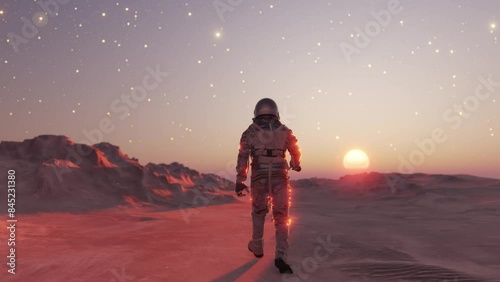 The watermark will not be included on Sticker.: Astronaut walking on a alien planet in outer space