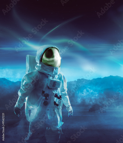 The watermark will not be included on Sticker.: Astronaut walking on an unexplored planet