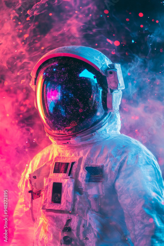 The watermark will not be included on Sticker.: Astronaut wearing helmet against abstract cosmic background - man in spacesuit with neon lighting and