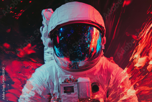 The watermark will not be included on Sticker.: Astronaut wearing helmet against abstract cosmic background - man in spacesuit with neon lighting and