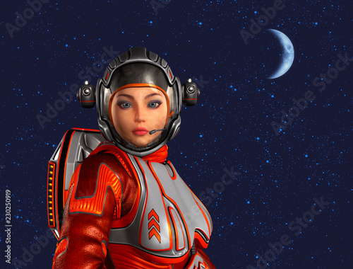 The watermark will not be included on Sticker.: Astronaut woman in front of space background with stars and moon - 3d rendering -