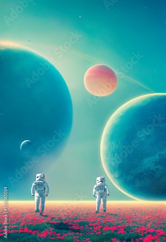 The watermark will not be included on Sticker.: Astronauts in a spacesuit walks around an alien planet and explores its surface - the concept of spac
