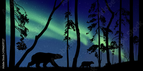 Sticker bears family in forest at night. animal silhouettes. aurora borealis