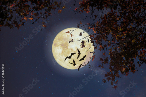 Sticker : Beautiful autumn fantasy - maple tree in fall season and full moon with star - retro style with vinta