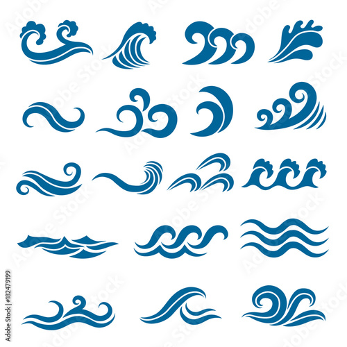 The watermark will not be included on Sticker.: Big set of stylized ocean waves - colored vector set