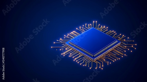 Blue electronic circuit board with microchip and illuminated connections on dark backgroundSticker