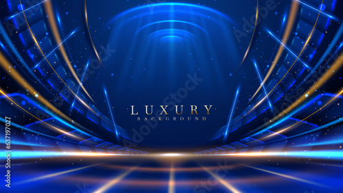 The watermark will not be included on Sticker.: Blue luxury background with golden line decoration and curve light effect with bokeh elements - moder