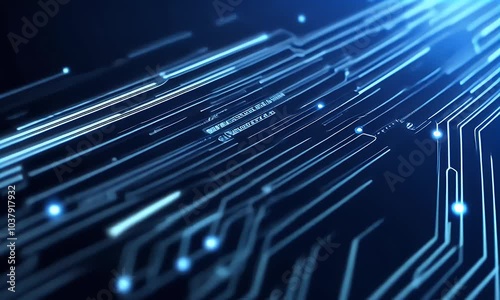 Sticker : Blue technology background with circuit board lines and glowing dots on dark blue background vector