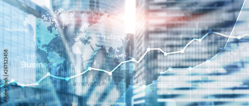 Sticker : Business abstract background double exposure graph, chart and diagram - world wide map and - global bu