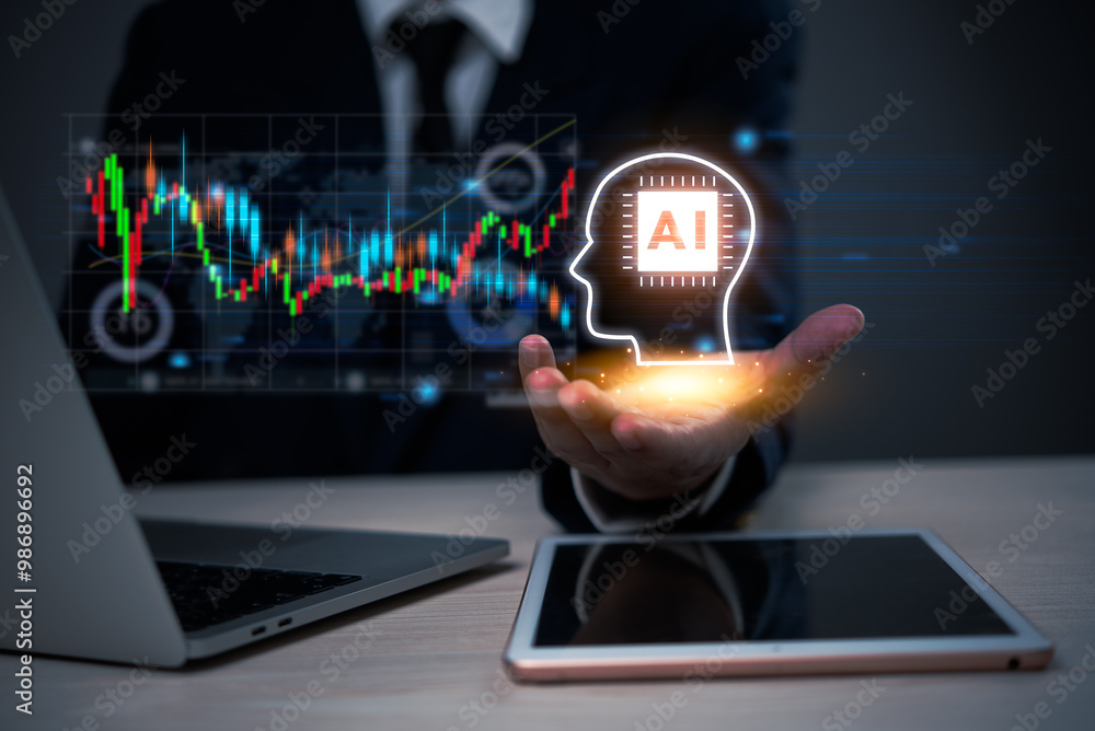 Sticker : Businessman holding ai head icon with financial data graph artificial intelligence in finance concep