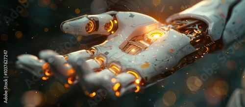 Close-up of a robotic hand with glowing lights and intricate mechanisms, set against a dark backgrouSticker