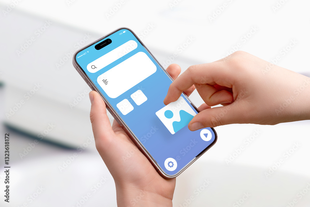 Sticker close-up of hand holding smartphone, placing picture image box on app interface, concept of drag-and - Stickers Sticker close-up of hand holding smartphone, placing picture image box on app interface, concept of drag-and - Stickers