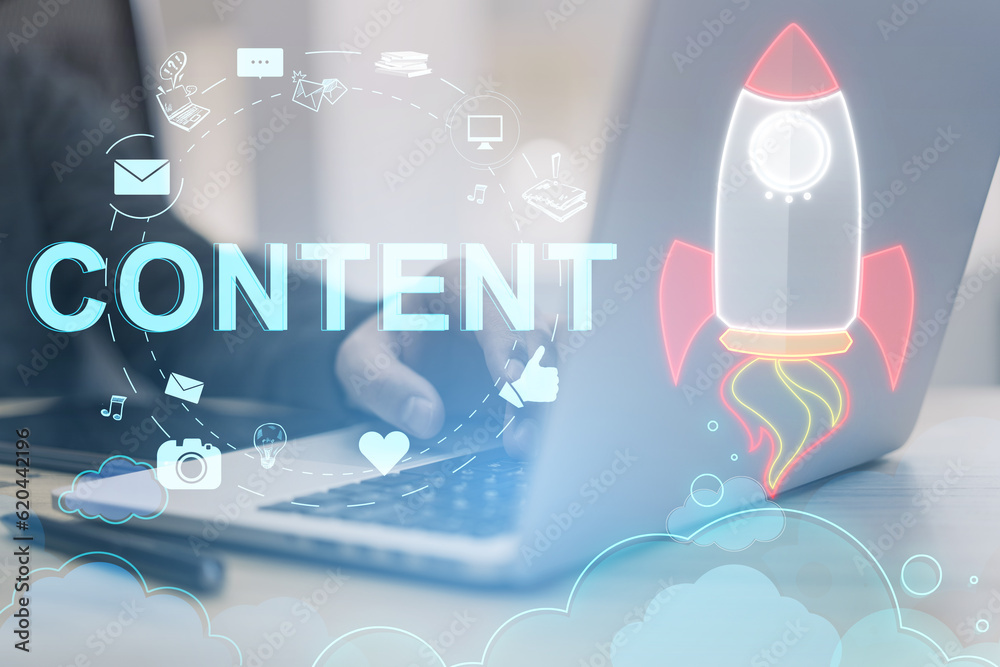 Close up of hands using laptop keyboard with creative rocket ship sketch on blurry background - conteSticker