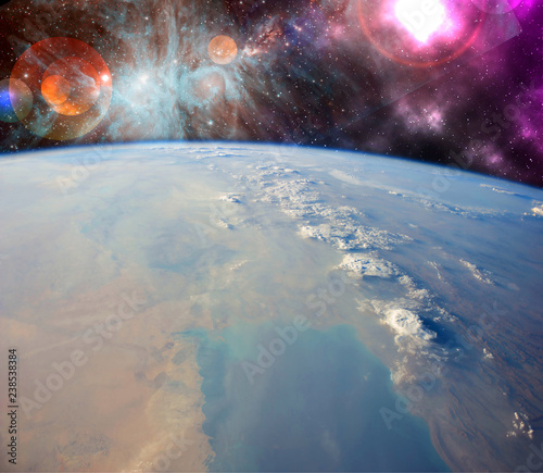 The watermark will not be included on Sticker.: Close up planet earth biosphere in space with stars and galaxy on background - elements of this image